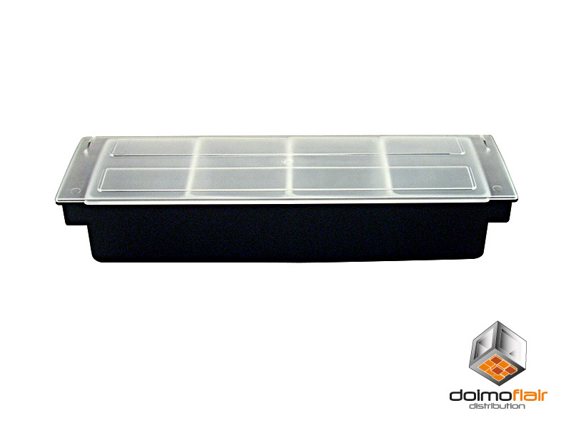 Organize cocktail sets or food preparation hygienically and within easy reach. Put crushed ice under the stakes and chill the prepared food so you can enjoy it longer. The black housing holds up to four white inserts with a capacity of 0.7 l. The solid lid is transparent and protects the food from external environmental influences. Put this ingredient container in the refrigerator outside opening hours. For easier transport, the side-mounted handles are suitable.